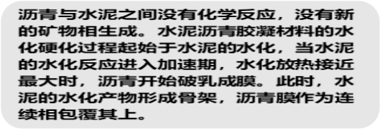 清華大學土木工程系工程安全與耐久教育部重點實驗室楊進波等教授研究表明:瀝青與水泥之間沒有化學反應,水泥水化產物中沒有新的礦物生成。水泥瀝青膠凝材料的水化硬化過程起始于水泥的水化反應;當水泥的水化反應進入加速期,水化放熱速率接近Z大時,瀝青開始破乳成膜。大量的水泥水化產物和包覆在其表面的連續瀝青膜形成硬化漿體骨架。