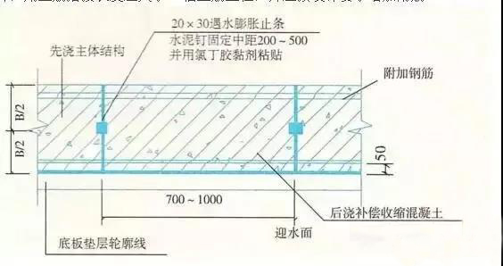 1、后澆帶應設在受力和變形較小的部位,間距宜為30m~60m,寬度宜為700~1000mm。后澆帶可做成平直縫,結構主筋不宜在縫中斷開,如必須斷開,則主筋搭接長度應大于45倍主筋直徑,并應按設計要求增加附筋。
