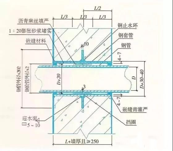 3、結構變形縫或管道伸縮量較大或有更換要求時,應采用套管式防水法,套管應加焊止水環。