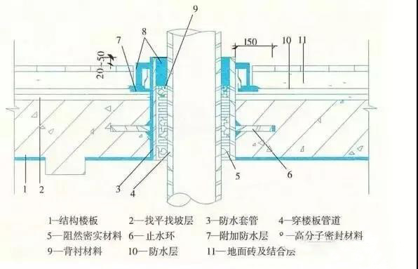 (4)穿樓板管道應設置止水套管或其他止水措施,套管直徑應比管道大1~2級標準;套管高度應高出裝飾地面20~50mm。套管與管道間用阻燃密實材料填實,上口應留10~20mm凹槽嵌入高分子彈性密實材料。用于熱水管防水處理防水材料和輔料,應具有相應耐熱性能。