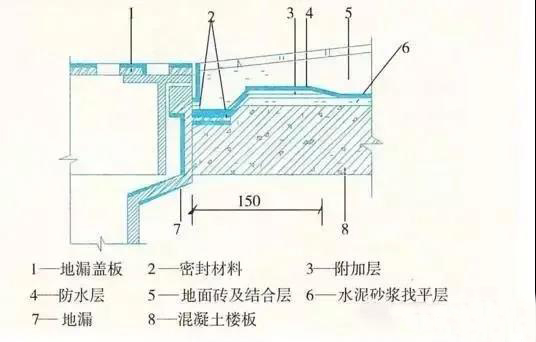 (2)地漏與地面混凝土間應留置凹槽,用合成高分子密封膠進行密封防水處理。地漏四周應設置加強防水層,加強寬度不應小于150mm。防水層在地漏收頭處,應用合成高分子密封膠進行密封防水處理。