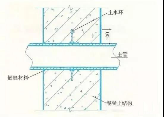 2、結構變形或管道伸縮量較小時,穿墻管可采用主管直接埋入混凝土內的固定式防水法,并應預留凹槽,槽內用嵌縫材料嵌填密實。